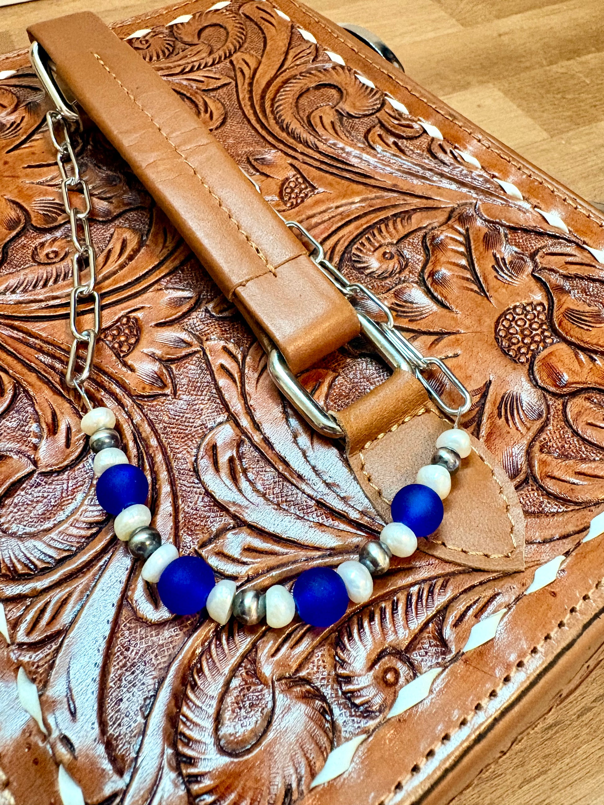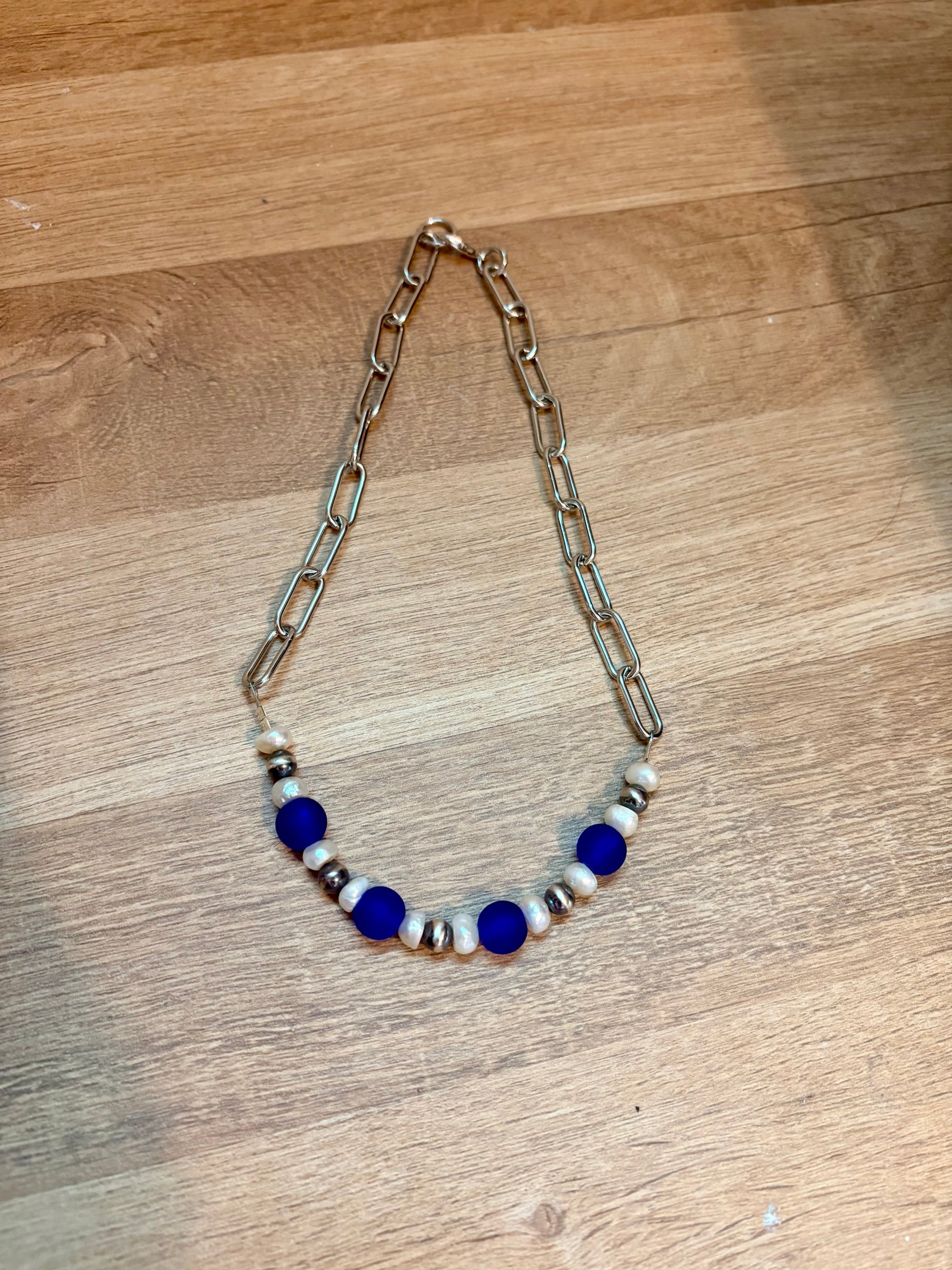 15" bar necklace with 6mm pearls, blue beads, and white pearls
