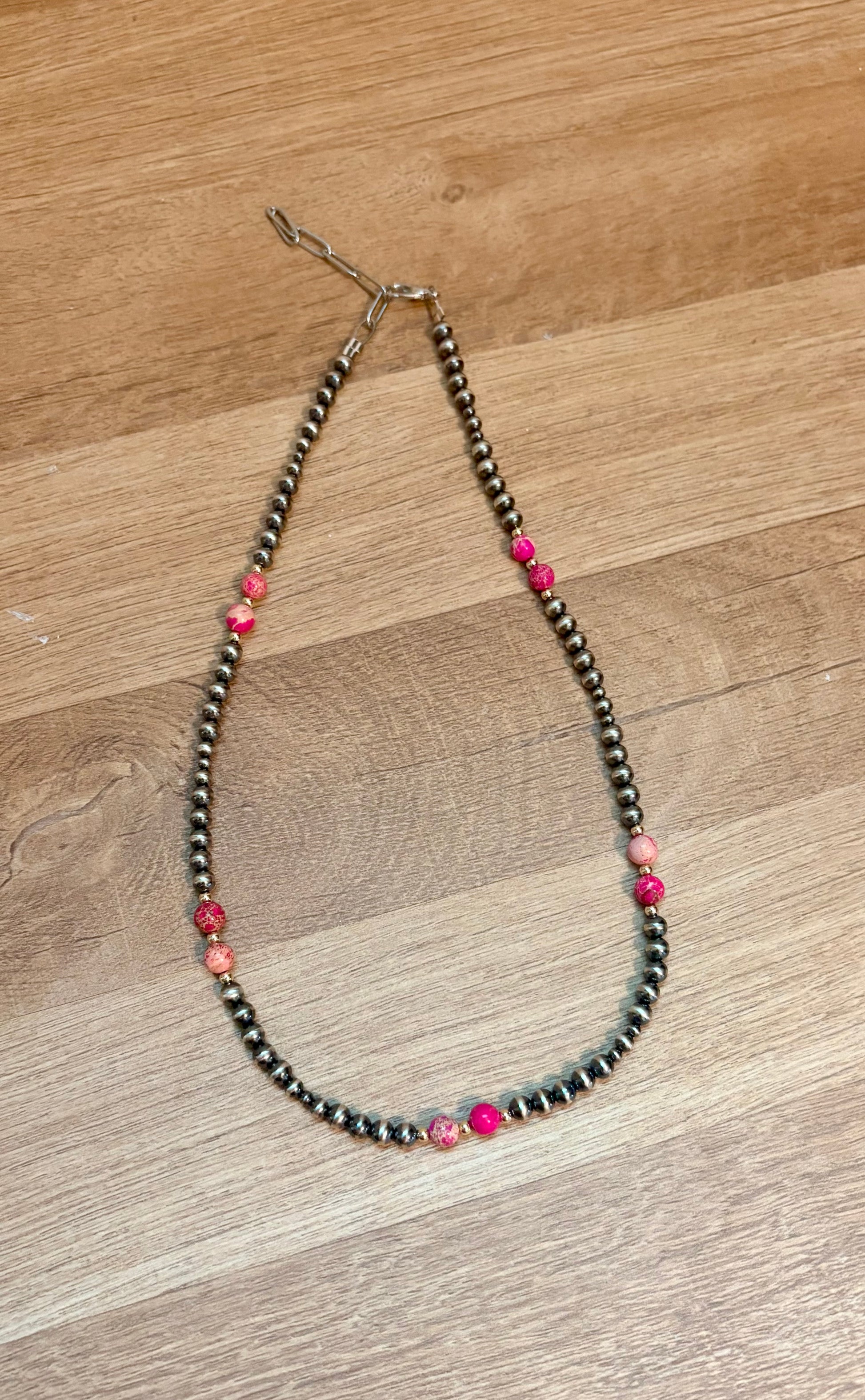 17-19" necklace with 5mm pearls, 3mm gold-filled beads, and pink sea jasper