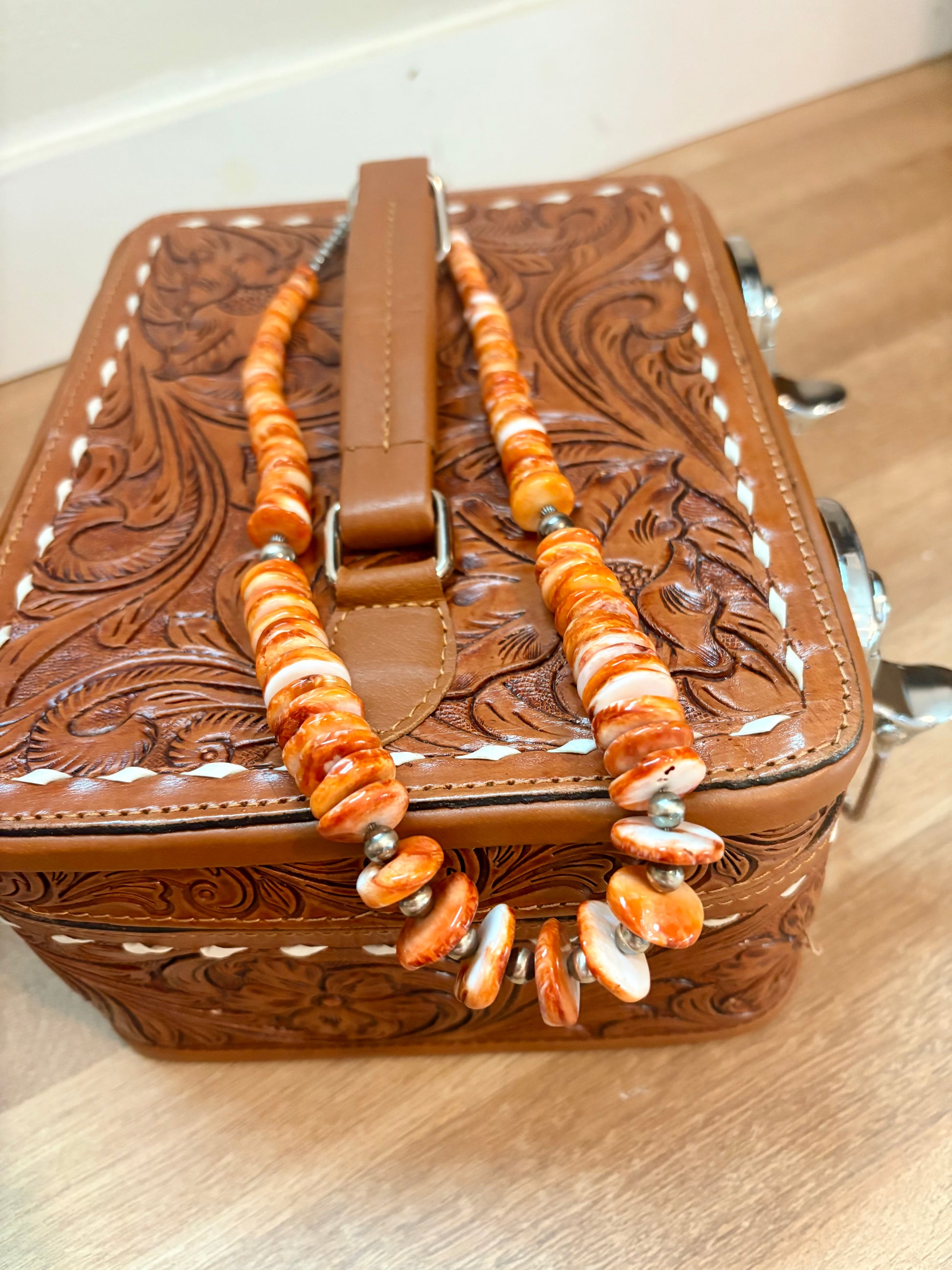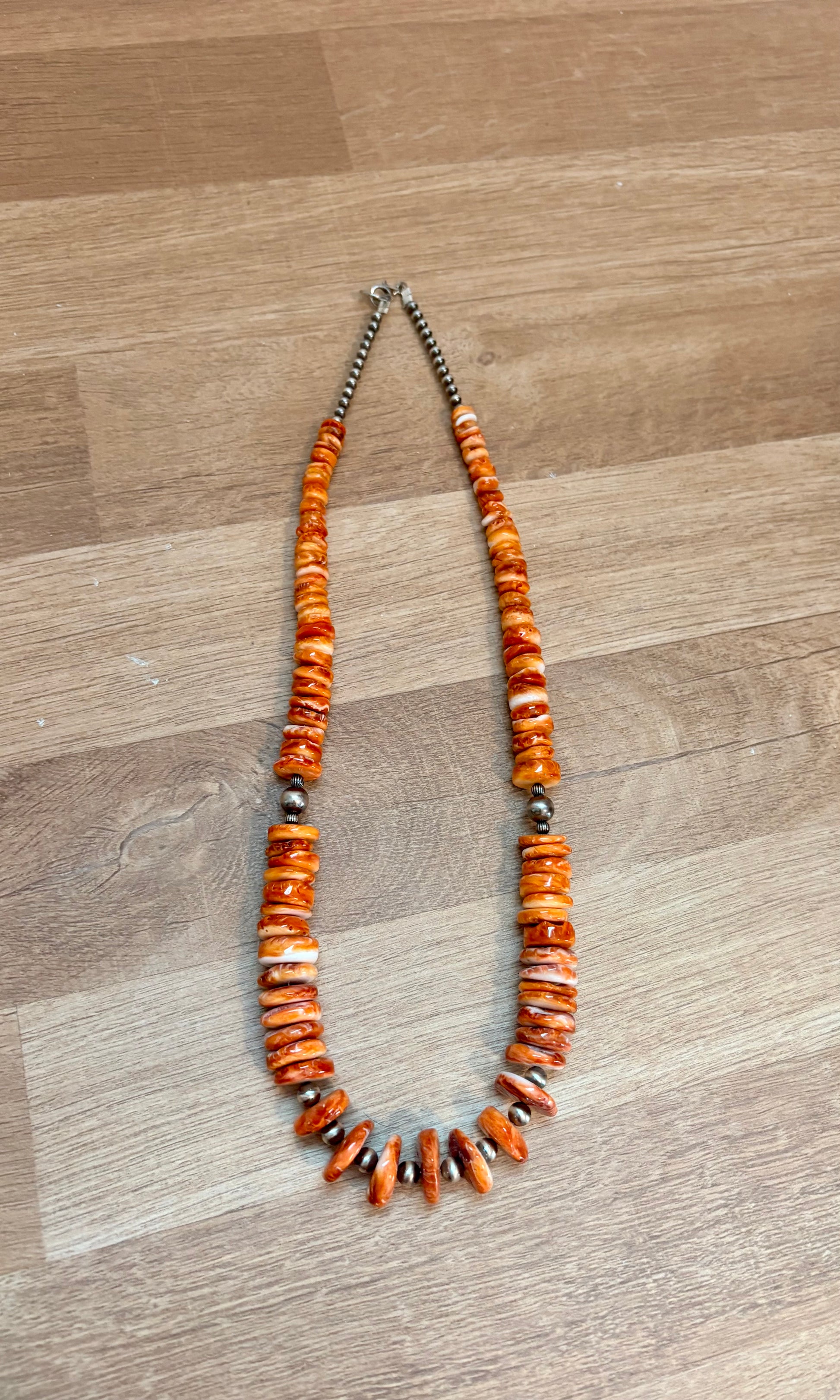 22" necklace with orange spiny, 6/8mm pearls with 4mm textured pearls